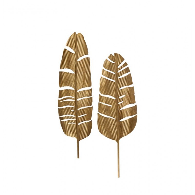 Juego decorativo de dos hojas de diferente tamaño fabricadas en metal/ latón antiguo. Aporta un toque elegante y especial jugando con su diseño sobre la pared en cualquier rincón del hogar. Dimensiones: 76 x 20,5 x3 / 76 x 23 x 3 cm.