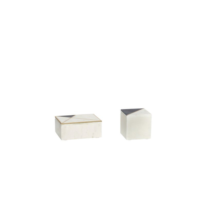 Conjunto de dos cajas de diferentes tamaños de la firma escandinava Hübsch, fabricadas en mármol y tapa decorada con motivos geométricos a base de latón y azul. Son ideales como joyeros en un tocador, suelta llaves en cualquier aparador de entrada, como decoración en mesas auxiliares, estanterías...