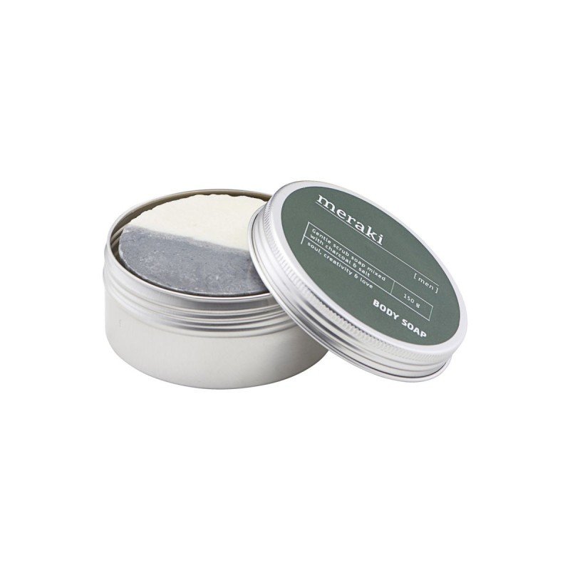 Este hidratante y nutritivo jabón para el cuerpo de Meraki está hecho especialmente para hombres. El jabón contiene carbón y sal, lo que hace que sea un perfecto exfoliante corporal. El exfoliante eliminara las células muertas de la piel y, por lo tanto, hará que la piel se vea y sienta extremadamente suave y limpia después de su uso. Frota el jabón cuidadosamente sobre tu piel y lávate bien después de usarlo. Si lo deseas, termina el tratamiento con una loción corporal. Este tratamiento hará que tu piel se sienta suave y saludable. Formato pastilla 150 g.