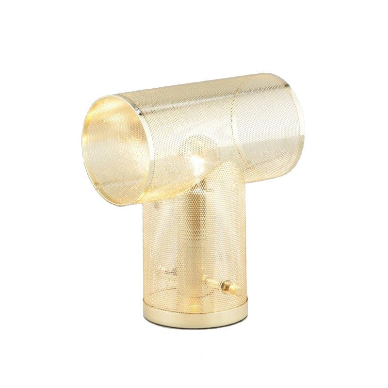 Lámpara de sobremesa de diseño nacional RACK GLAM en acabado ORO brillo. Con una curiosa forma tubular semitransparente en forma de T, aporta una luz cálida y acogedora a cualquier rincón del hogar. Contiene un dispositivo que regula, además del encendido y apagado, la intensidad de La Luz.